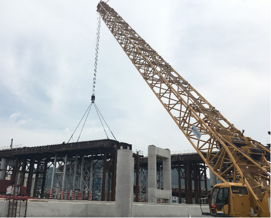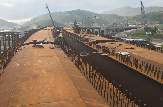 樂清南塘鋼橋本工程LY匝道、LZ匝道、D匝道、MY匝道部分為鋼結(jié)構(gòu),鋼結(jié)構(gòu)采用的形式是疊合梁結(jié)構(gòu),MY匝道結(jié)合梁橋橋?qū)?2.3m,橋跨布置為40+50m,在甬臺溫高速中央分隔帶上設獨柱墩。主梁中心梁高2.2m,鋼梁高1.8m。全橋處于緩和曲線和圓曲線段上,橋面設置4.847~5%的橫坡,鋼箱梁按等高制作,頂、底板傾斜形成5%的橫坡,超高段的橫坡差值通過橋面板梗肋的高度來調(diào)整,MY匝道結(jié)合梁斷面結(jié)構(gòu)圖如下:單個開口鋼箱梁底寬為3.1m,底板厚度44mm、24mm,底板橫向共設5道縱向板式加勁;單個開口鋼箱梁設2道腹板,腹板中心間距3m,腹板厚度為24mm和16mm,腹板內(nèi)設豎向加勁;鋼箱梁上翼板寬度0.6m,鋼板厚度24mm,翼板頂面設剪力釘。鋼板內(nèi)設橫隔板,標準厚度12mm,支點附近加厚至30mm。兩個開口鋼箱梁通過工字形橫梁連接。